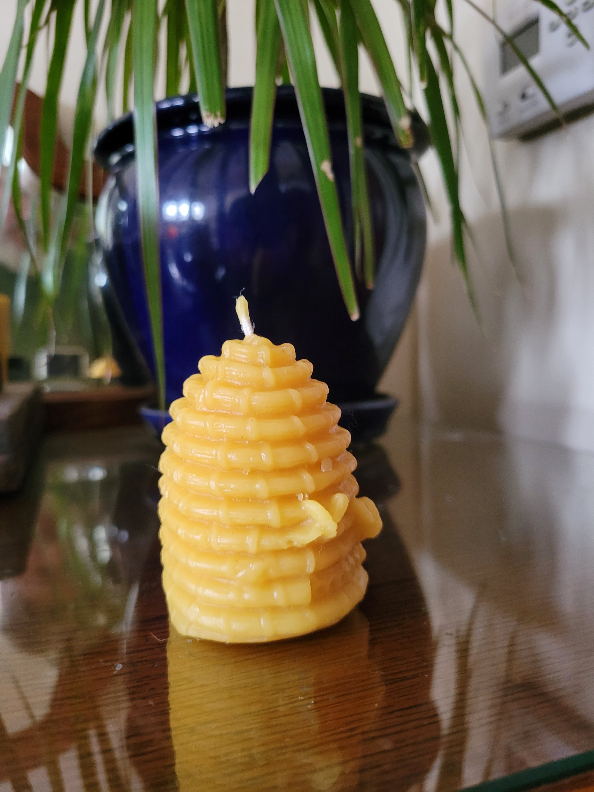 A couple of inches tall, and made of pure beeswax these have a burn time of over 3 hours and provide that wonderful natural scent when beeswax is in the room