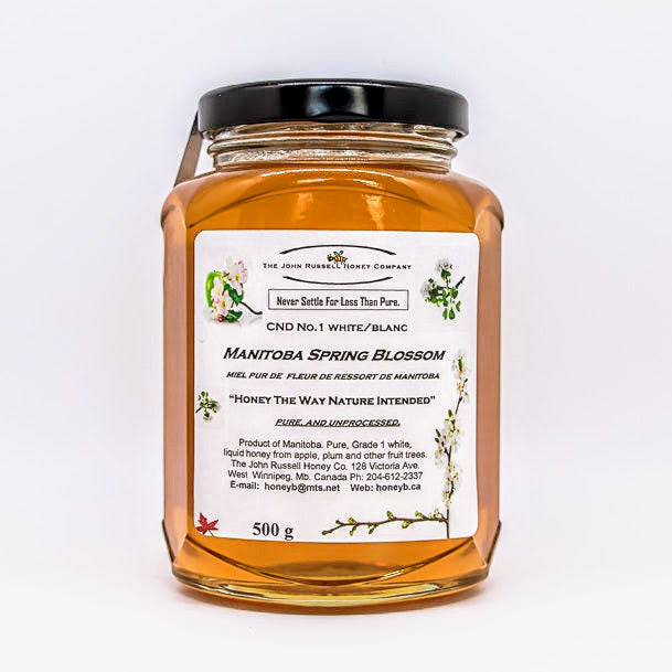 Spring blossom honey is one of the first extracted honeys of the season. A blend of apple, dandelion, plumb, saskatoon and other spring blooms makes a unique and delicately-flavoured favourite.