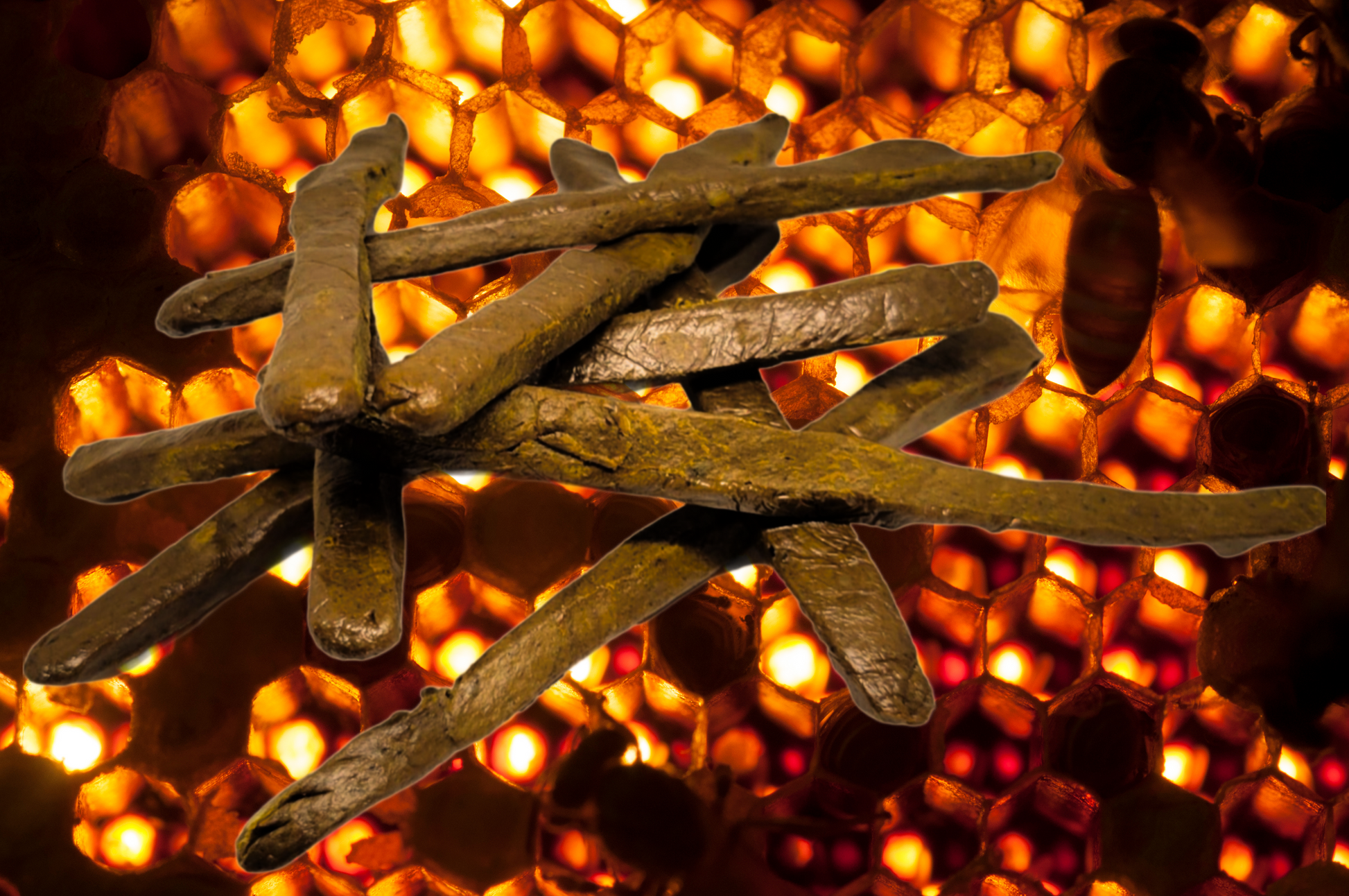 Propolis is a resinous substance bees gather from select trees. It's used to line the hive to keep it healthy, and help keep the bee colony healthy, too. They use it in weatherproofing and construction to caulk cracks and varnish the interior of the hive.